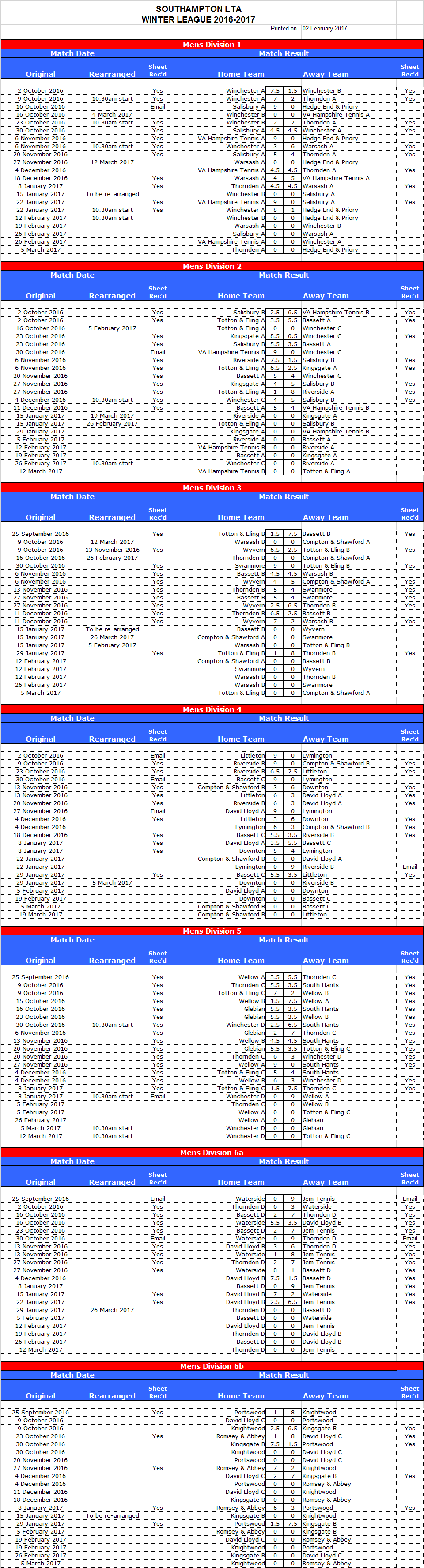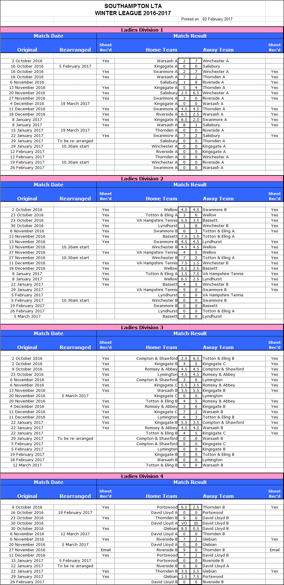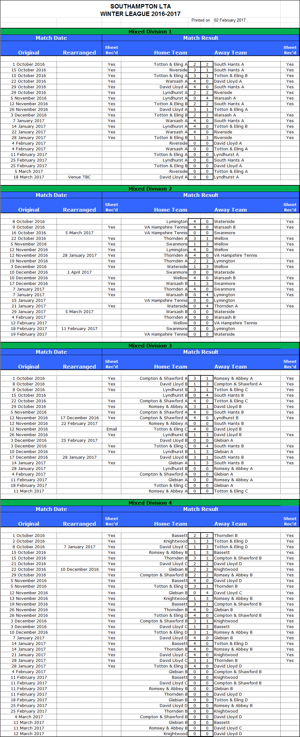 Current / Most Recent Winter League Fixtures / Results